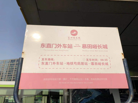 慕田峪长城专车在东直门外场站有自己专门的站台和站牌。 该专线车目前每天只开通一趟,座位有限,尽量提前半小时到车站,以确保有座位。